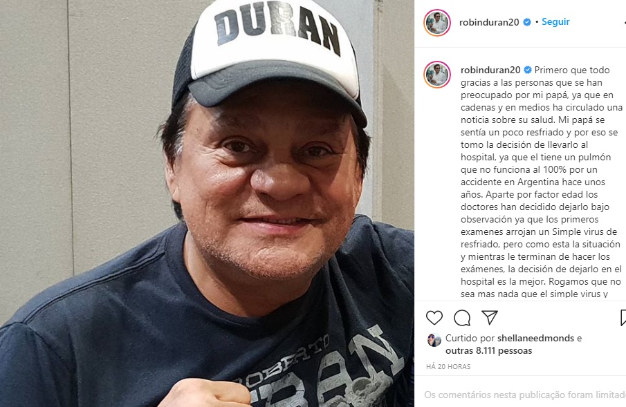 Nesta sexta-feira (26) houve a confirmação que o ex-pugilista Roberto Durán contraiu coronavírus – seu filho Robin Durán revelou notícia através das suas redes sociais (clique aqui ou veja abaixo). De acordo com ele, seu pai está internado após realizar exames, mas sem sintomas mais sérios do que um simples resfriado.