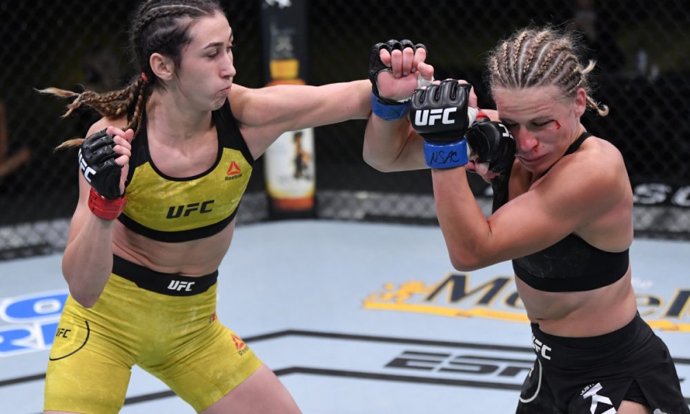 A primeira luta da noite do UFC Las Vegas 10 contou com uma apresentação de gala em duelo realizado praticamente todoe em pé. A promissora atleta da Colômbia Sabina Mazo, de apenas 23 anos, deu show de garra e técnica diante da ex-campeã mundial de muay thai Justine Kish para vencer com uma finalização pela primeira vez em sua carreira.