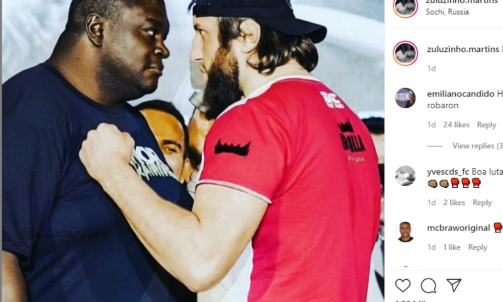 O veterano ‘Zuluzinho’, de 42 anos e 180 kg, lutou contra a promessa Yusup Shuaev e esteve próximo de tirar a invencibilidade do rival. No primeiro round, o brasileiro aplicou um knockdown no russo e comemorou o possível nocaute, se jogando no chão (veja abaixo ou clique aqui). No entanto, o árbitro não encerrou o combate e sim o assalto. Na sequência, o duelo continuou e os juízes laterais premiaram o atleta da casa com a vitória por decisão majoritária, resultado que deixou o gigante maranhense inconformado.