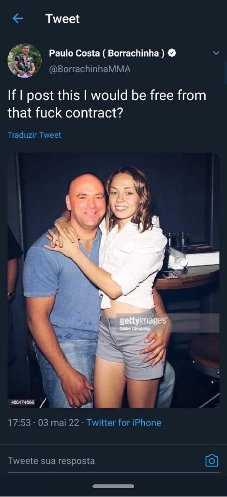 “Se eu postar isso, estaria livre desse contrato de merda?”, questionou o lutador em inglês sua conta oficial no ‘Twitter’. A imagem original, na verdade, conta com Pat Barry, marido de Rose, ao lado da atleta.