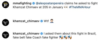 “O que é isso? Eu perguntei a eles sobre essa luta no Brasil. Cinturão falso, técnico falso, lutador falso”, respondeu o lutador através de sua conta oficial no ‘Instagram’, no perfil do site ‘MMA Fighting’.