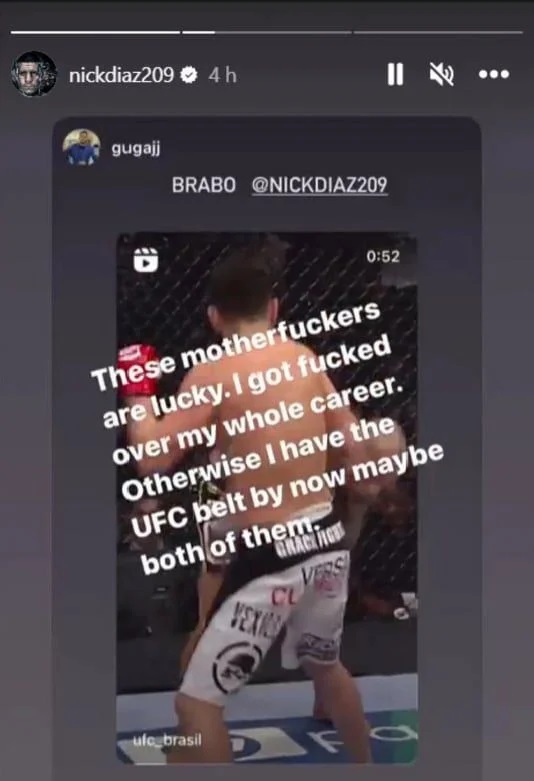 “Esses filhos da p*** têm sorte. Eu me f*** durante toda a minha carreira. Caso contrário, eu teria o cinturão do UFC agora, talvez dois’, declarou o ex-desafiante ao título do UFC via ‘Stories’ em sua conta oficial no ‘Instagram’.