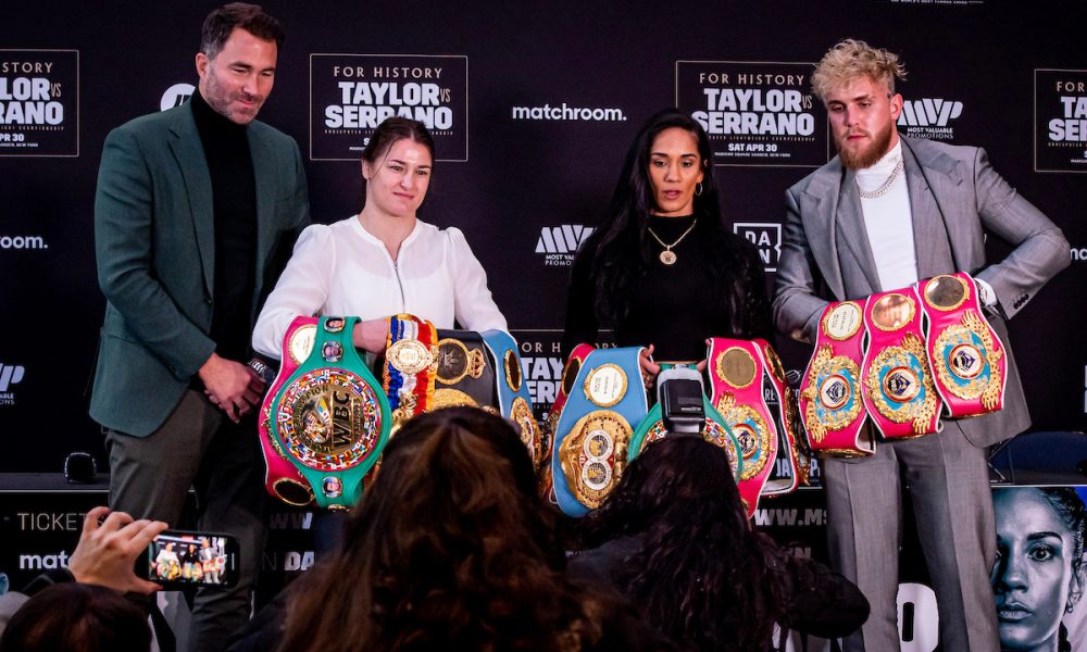 Em jogo no confronto estarão os cinturões peso-leve da Associação Mundial de Boxe (WBA), do Conselho Mundial de Boxe (WBC), da Federação Internacional de Boxe (IBF), da Organização Mundial de Boxe (WBO), e da revista ‘The Ring’, todos atualmente sob poder de Katie Taylor. Por sua vez, a porto-riquenha Amanda Serrano é a atual campeã unificada peso-pena e possui títulos mundiais em sete categorias diferentes, um recorde no boxe feminino.