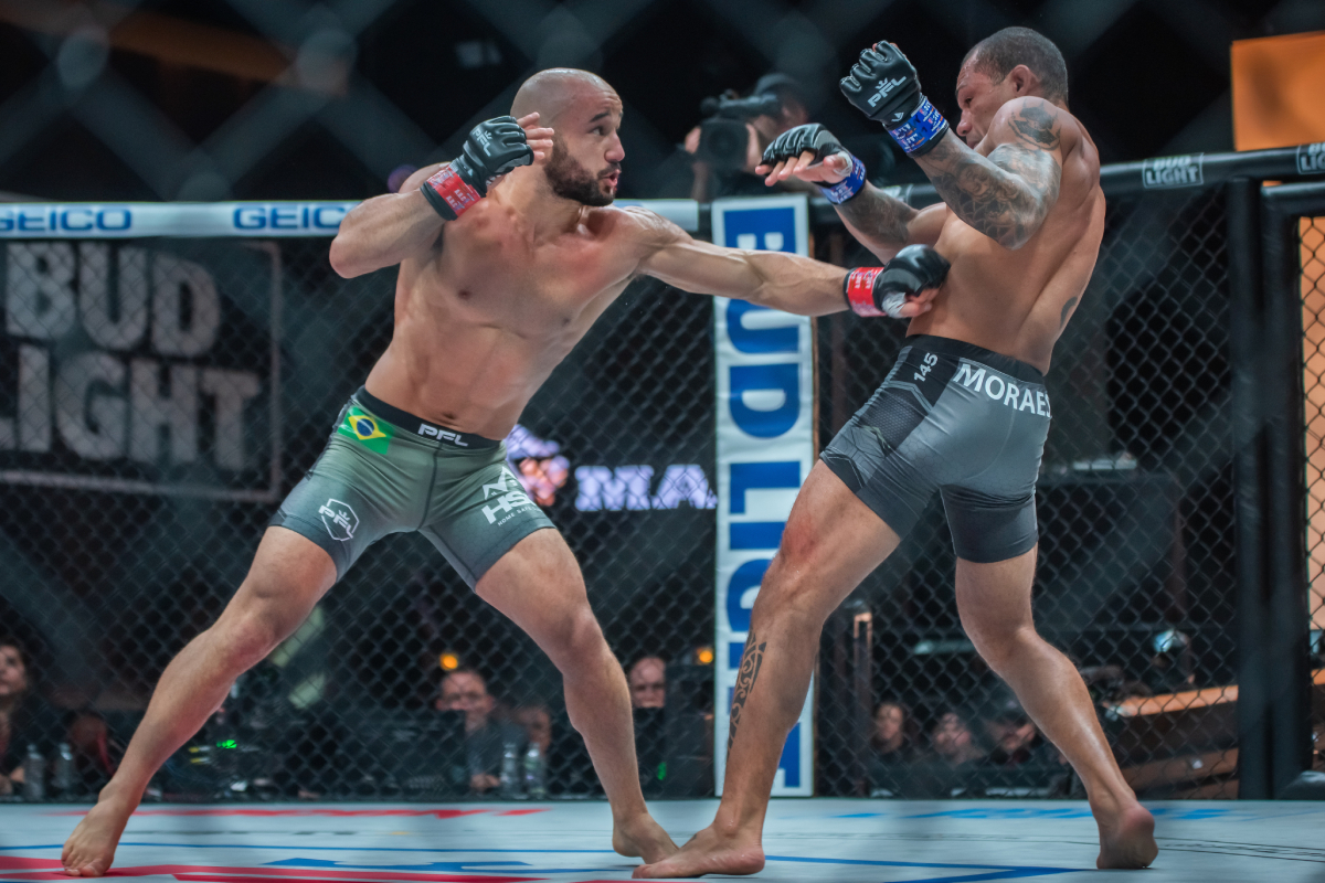 NEW YORK, NY - NOVEMBER 23: Shaymon Moraes wins via TKO in a huge comeback in rd 3 against Marlon Moraes at the 2022 PFL Championship at the Hulu Theatre inside Madison Square Garden in NYC. November 23, 2022 in New York, NY, United States. (Photo by Matt Davies/PxImages)
