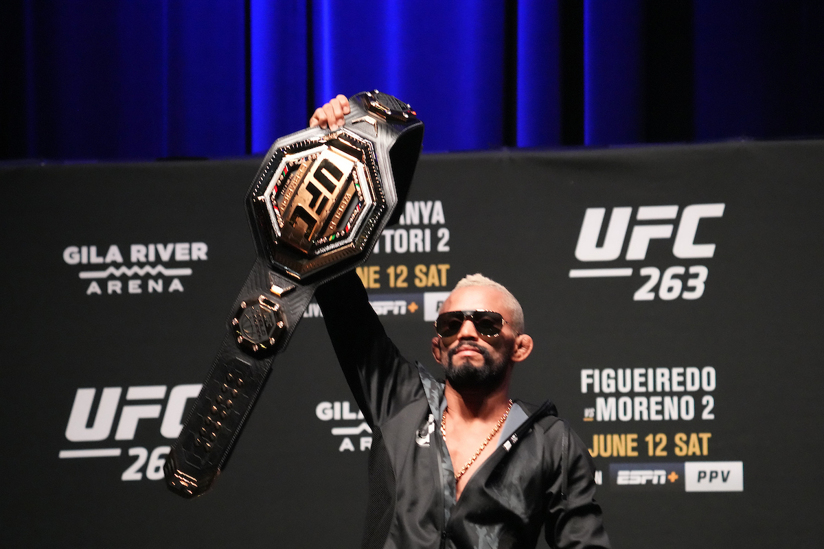 Assim como 'Poatan', outros dois brasileiros também alcançaram o lugar mais alto de suas categorias em 2022. O primeiro deles foi o paraense Deiveson Figueiredo. Em janeiro, o 'Deus da Guerra' venceu o mexicano Brandon Moreno no terceiro combate entre eles consecutivo e retomou o posto de campeão linear dos moscas (57 kg) do UFC - Louis Grasse/PxImages