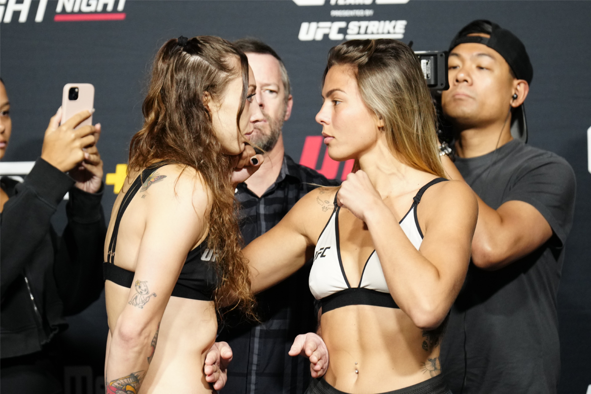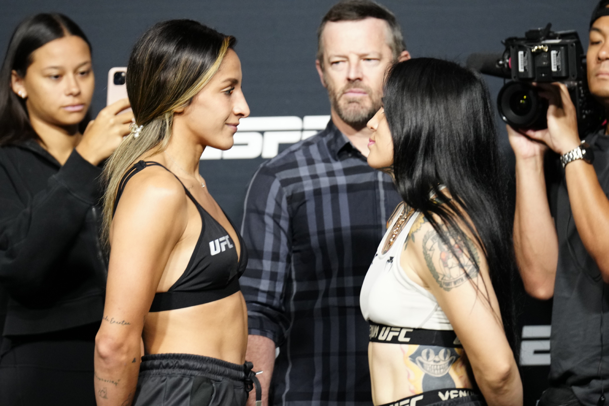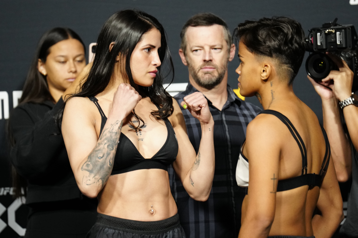 Outro confronto 100% verde-amarelo agendado para o card principal do UFC Vegas 78 colocará frente a frente as pesos-palhas Polyana Viana e Iasmin Lucindo. Com 10 anos de diferença entre elas, as duas atletas protagonizaram uma encarada séria após a pesagem - Louis Grasse/Ag Fight