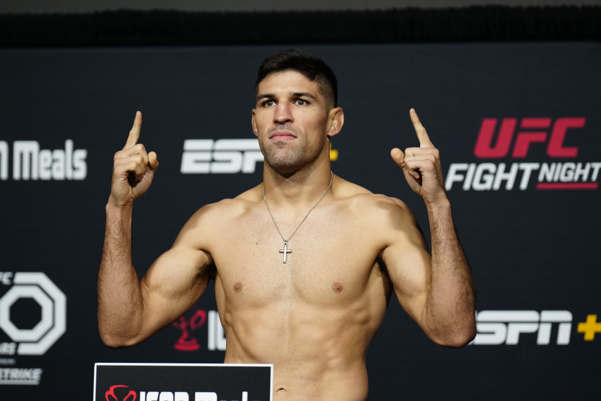 Vicente Luque, primeiro a subir na balança nesta sexta-feira, vive situação diferente do rival. Vindo de duas derrotas, o top 10 do meio-médio vive seu pior momento no UFC e tentará voltar à coluna das vitórias diante do veterano, em confronto que marca seu retorno ao octógono após um ano, por conta de um problema de saúde - Louis Grasse/Ag Fight