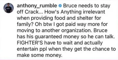 “Bruce precisa ficar longe do crack. Como algo é irrelevante fornecer comida e moradia para a família? Ah, a propósito, recebi muito mais por me mudar para outra organização. Bruce tem seu dinheiro garantido para poder falar. Lutadores têm que esperar e realmente entreter as pessoas quando têm a chance de ganhar algum dinheiro”, disparou.