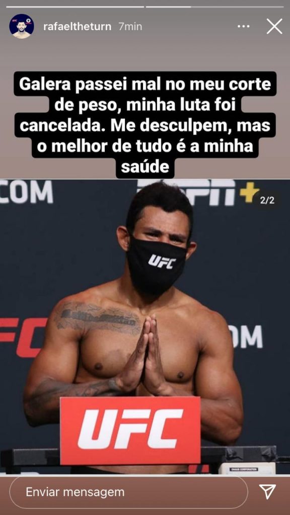 “Galera, passei mal no meu corte de peso e minha luta foi cancelada. Me desculpem, mas o melhor de tudo é a minha saúde”, disse o brasileiro, sem dar mais detalhes.