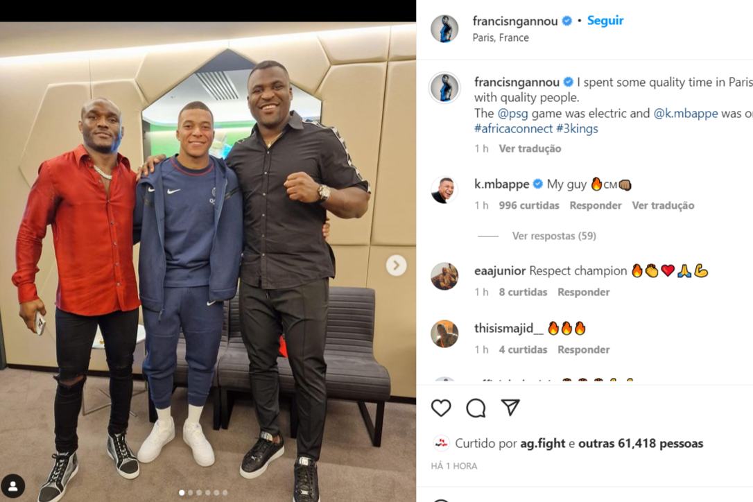 “Passei um tempo de qualidade em Paris ontem com pessoas incríveis. O jogo do PSG foi eletrizante e o Mbappé estava imparável. Obrigado PSG por nos receberem no jogo desta noite”, escreveu Ngannou em suas redes sociais.