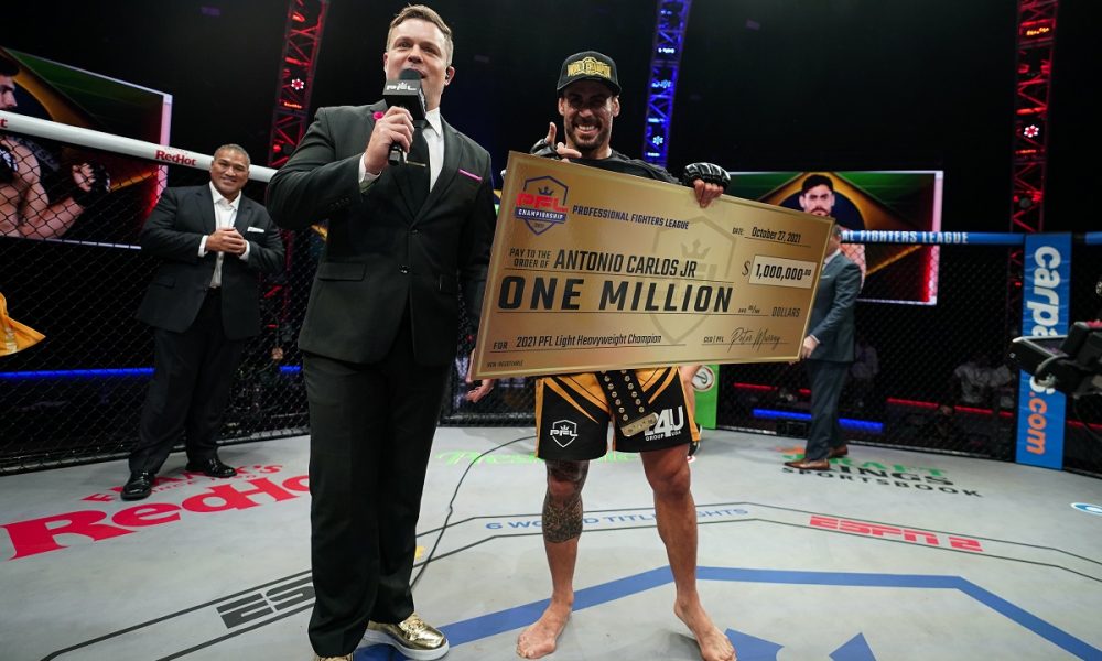 A noite da última quarta-feira (27) foi histórica para o Brasil na PFL. No último evento do ano, marcado pelas decisões dos torneios, os lutadores brasileiros, que estavam envolvidos em três finais, venceram todas. Bruno Cappelozza, Antônio ‘Cara de Sapato’, Raush Manfio conquistaram os GPS dos peso-pesados, meio-pesados (93 kg) e peso-leve (70 kg), respectivamente. Além do título, cada um levou para casa a quantia de um milhão de dólares (cerca de R$ 5,4 milhões), prêmio dado aos campeões.