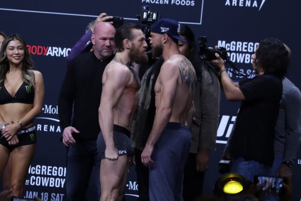 Com o carisma de sempre, Conor levantou o público presente e foi recebido com gritos dos torcedores mais fanáticos. Mais calmo, ‘Cowboy’ adotou uma postura menos expressiva. Mas apesar dos comportamentos distintos, os dois fizeram cara de poucos amigos ao praticamente colarem os rostos durante a aguardada encarada da luta principal deste sábado.