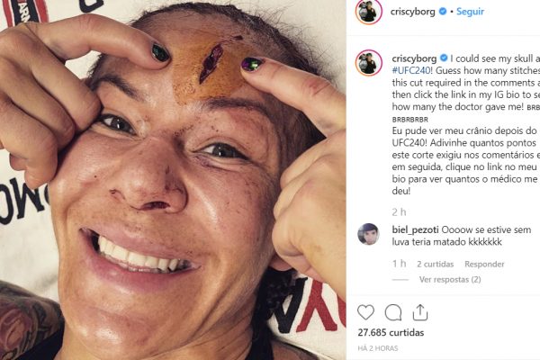 “Eu pude ver meu crânio depois do UFC 240! Adivinhe nos comentários quantos pontos este corte exigiu”, escreveu Cyborg, que encarou a lesão com bom humor.