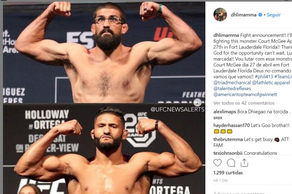 O goiano entrará em ação no dia 27 de abril, no UFC Miami. Através de suas redes sociais (veja abaixo ou clique aqui), Dhiego confirmou o combate que será disputado contra Court McGee. Através da legenda do post, Lima aproveitou para exaltar o americano, que também vem de vitória na organização.