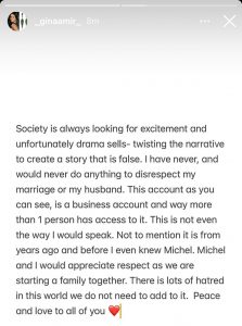“A sociedade está sempre procurando por emoção e infelizmente o drama vende, distorcendo a narrativa para criar uma história que é falsa. Eu nunca fiz e nunca faria nada para desrespeitar meu casamento ou meu marido. Essa conta, como você pode ver, é uma conta comercial e muito mais de uma pessoa tem acesso a ela. Essa nem é a maneira como eu falaria. Sem mencionar que é de anos atrás e antes mesmo de conhecer Michel. Michel e eu agradeceríamos o respeito, pois estamos começando uma família juntos. Há muito ódio neste mundo que você não precisa adicionar a ele. Paz e amor para todos vocês”, escreveu a esposa de Michel.