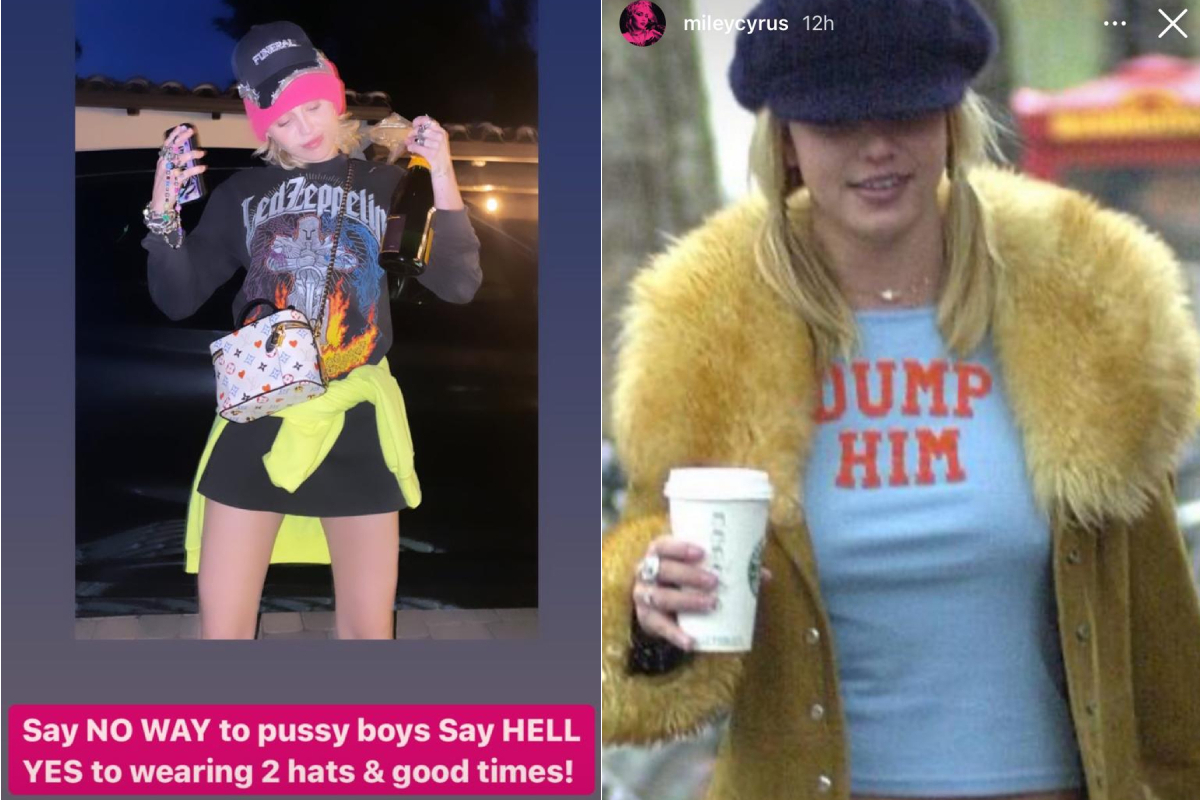 “Diga não para maricas. Diga VAMOS NESSA para usar dois chapéus e ter um bom momento. Jogue ele fora”, postou Miley nos ‘stories’ de sua conta oficial no ‘Instagram’.