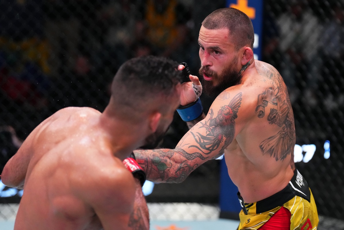 LAS VEGAS, NEVADA - APRIL 30: (R-L) Marlon Vera of Ecuador punches Rob Font in a bantamweight fight during the UFC Fight Night event at UFC APEX on April 30, 2022 in Las Vegas, Nevada. (Photo by Chris Unger/Zuffa LLC)