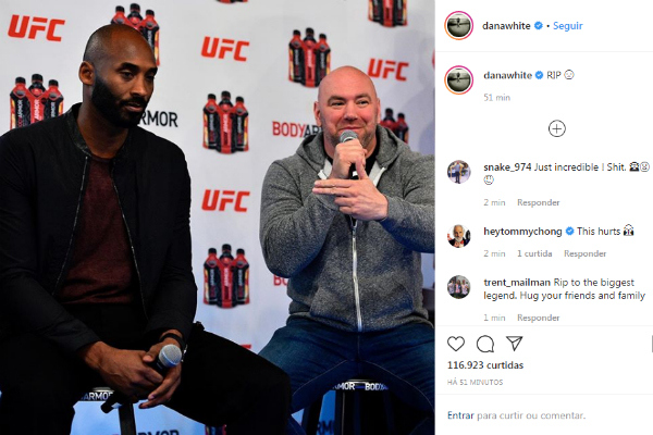 Um dos primeiros a manifestar suas condolências quanto ao ocorrido, Dana White – presidente do UFC – publicou uma foto com o astro do basquete tirada em um evento promocional de uma marca de bebidas energéticas que patrocinava Kobe e o Ultimate, com a legenda ‘RIP’ (sigla para ‘descanse em paz’ em inglês). Além do dirigente, Amanda Nunes, Daniel Cormier, Michael Bisping, Cris ‘Cyborg’, Glover Teixeira, Jorge Masvidal, Gilbert ‘Durinho’, Aljamain Sterling, entre outros atletas ligados ao MMA postaram seus lamentos pela morte de Bryant.