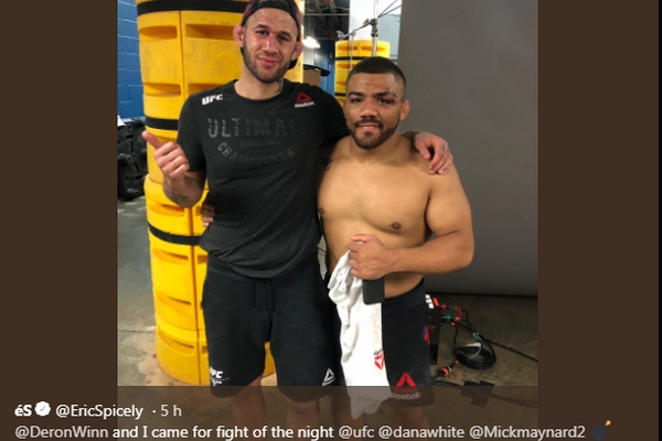Eric Spicely tem muito a agradecer a Deron Winn, que o derrotou no UFC Greenville, no último sábado (22). O motivo é simples: o combate entre os dois, que abriu o evento realizado no estado americano da Carolina do Sul, ganhou o prêmio de ‘Luta da Noite’. Assim, os dois receberam, além das suas bolsas pelo combate, mais 50 mil dólares — o equivalente a R$ 191 mil. E ‘Zebrinha’ comemorou muito via Twitter, porque isso melhorou muito a sua situação financeira.