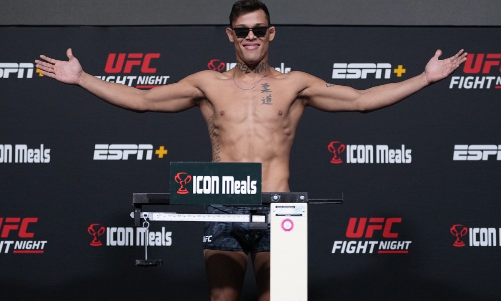 Oriundo do programa ‘Contender Series’, Caio Borralho faz sua estreia no UFC neste sábado, diante do russo Gadzhi Omargadzhiev. Na pesagem realizada nesta sexta-feira (15), em Las Vegas (EUA), o brasileiro e seu oponente cravaram o mesmo peso, 84,3 kg, e garantiram o duelo no card do show. De óculos escuros, o carismático maranhense não deixou o palco sem antes tirar alguns sorrisos dos jornalistas presentes ao replicar a comemoração e o bordão (Receba!) que ganhou fama internacional através dos vídeos publicados na internet pelo ‘Luva de Pedreiro’, personagem criado pelo baiano Iran Ferreira (veja abaixo ou clique aqui).