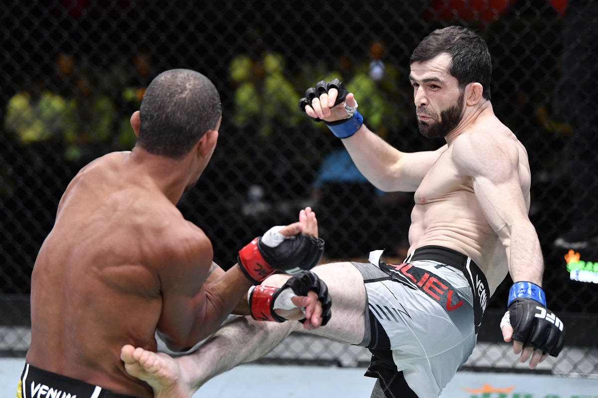 LAS VEGAS, NEVADA - JUNE 26: (R-L) Timur Valiev of Russia kicks Raoni Barcelos of Brazil in a bantamweight fight during the UFC Fight Night event at UFC APEX on June 26, 2021 in Las Vegas, Nevada. (Photo by Chris Unger/Zuffa LLC)