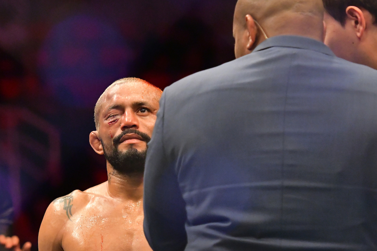 No último sábado (21), Deiveson Figueiredo subiu no octógono do UFC Rio para defender o cinturão linear peso-mosca contra Brandon Moreno, no quarto confronto disputado entre eles, uma marca inédita na organização. No terceiro round, o brasileiro recebeu um duro golpe do rival que rapidamente provocou um corte e um hematoma na região próxima ao seu olho direito, causando dificuldades para que ele pudesse enxergar. Após consulta com o médico do evento, o árbitro central da peleja optou por encerrar o duelo e dar a vitória ao mexicano, para revolta da torcida presente na ‘Jeunesse Arena’, que entendeu no momento que o oponente de ‘Daico’ teria aplicado um golpe ilegal (dedada no olho).