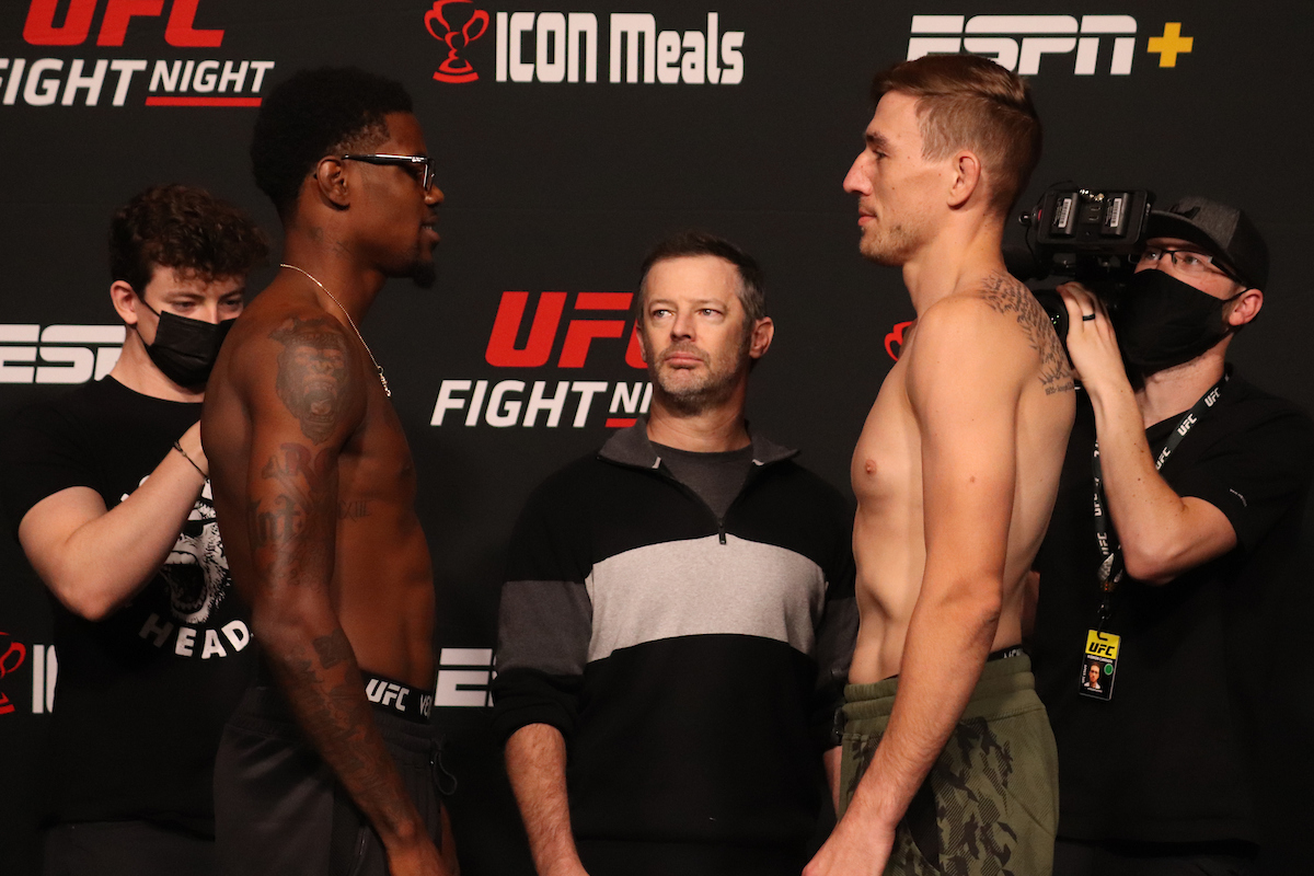 O combate transcorria normalmente até que, restando pouco mais de dois minutos para o fim do primeiro round, um choque de cabeças involuntário levou Holland à lona. Após cair com o rosto no solo, o peso-médio (84 kg) recuperou rapidamente a consciência, mas, já em desvantagem e ainda grogue, virou alvo fácil para o rival, que seguiu no ataque até conseguir a finalização.
