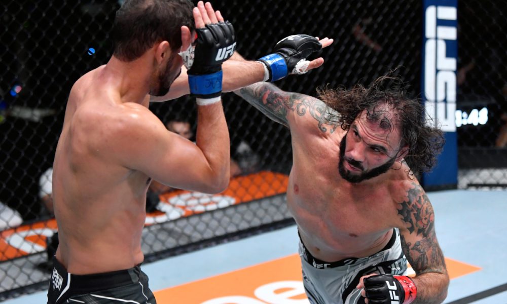 Em duelo de veteranos no octógono, Clay Guida e Leo Santos mediram forças no card principal do UFC Vegas 44 neste sábado (4). E o clássico confronto wrestling vs jiu-jitsu foi vencido pelo americano que surpreendeu e finalizou o multicampeão de jiu-jitsu no segundo assalto.
