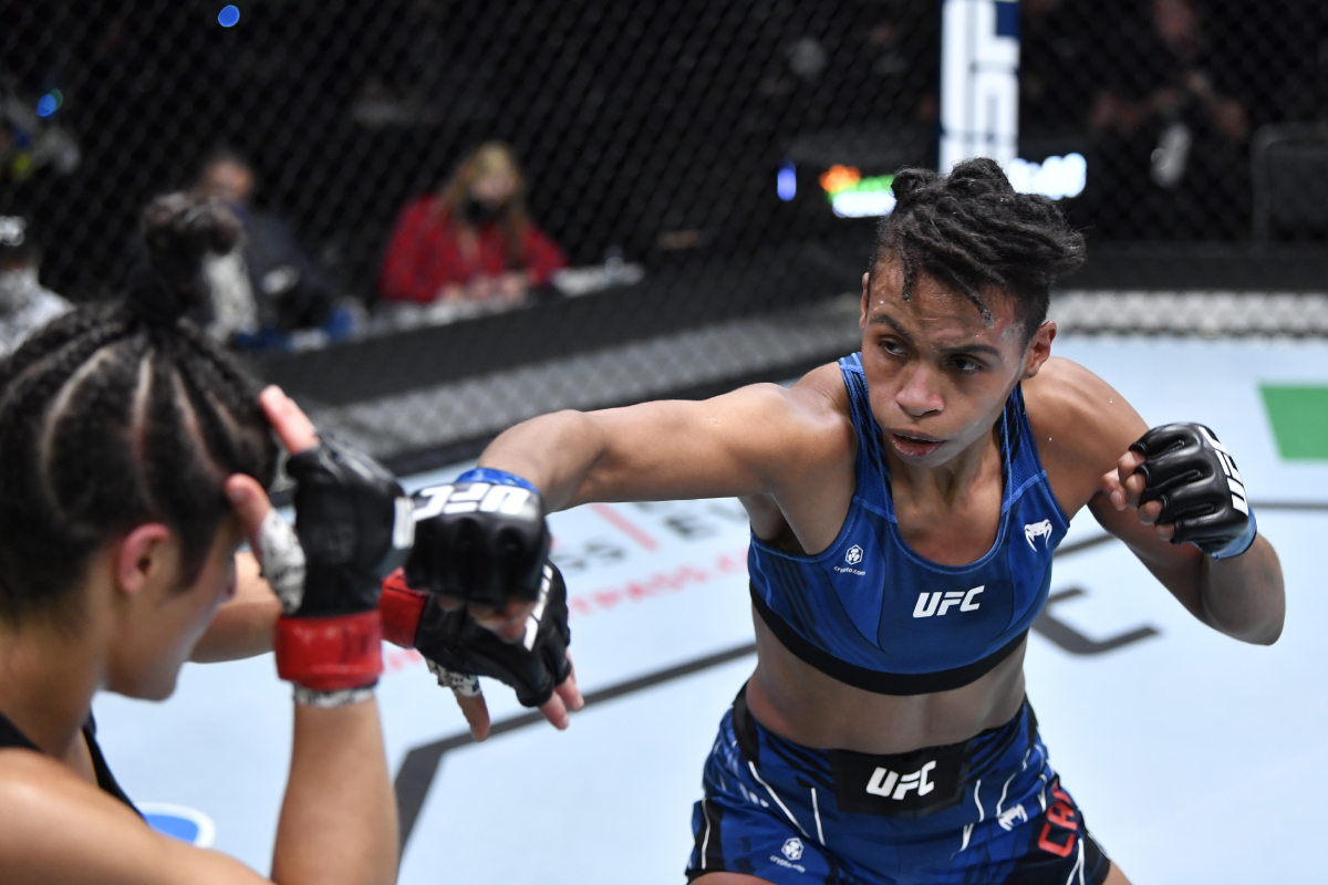 Estreante no UFC, Istela Nunes – que não competia desde 2018, período em que cumpriu suspensão após ser flagrada em um exame antidoping – mostrou afiado muay thai no octógono. No entanto, o casamento de estilos não lhe favoreceu e ela acabou superada pelo ‘abafa’ imposto pela rival.