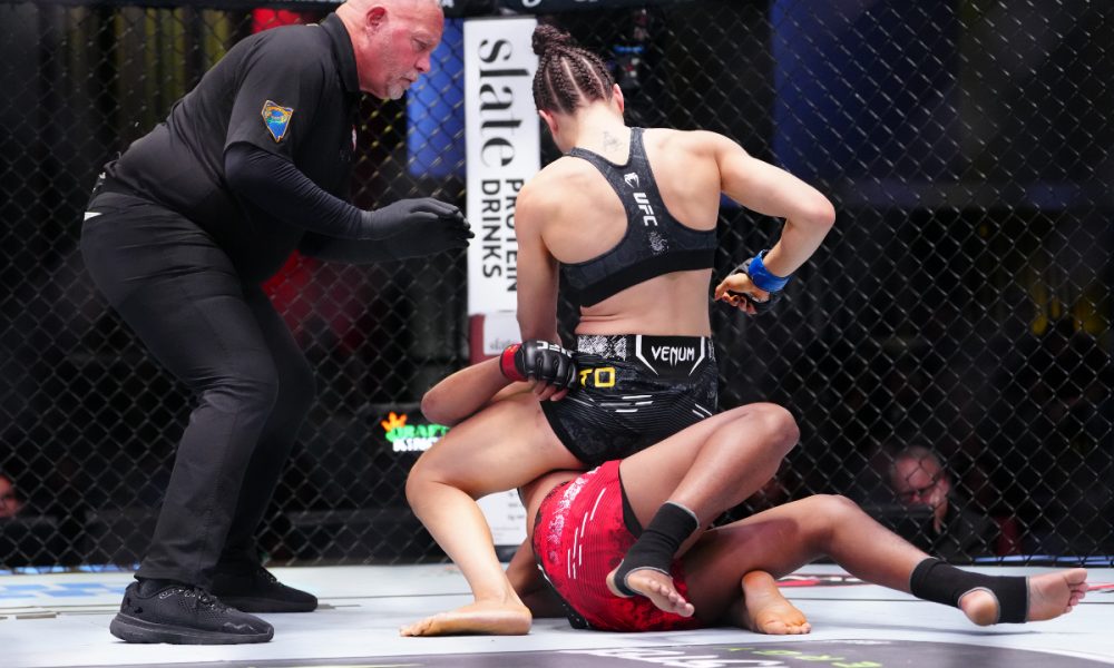 Depois de ver sua última luta ser cancelada durante a realização do evento, Melissa Gatto enfim voltou a competir no octógono mais famoso do mundo. Diante da compatriota Tamires Vidal, a brasileira não deu brechas para a oponente e venceu via nocaute técnico, no terceiro round. O desfecho da luta, porém, foi polêmico, já que a atleta de Campinas (SP) desferiu um soco na região dos seios da adversária antes de liquidar a fatura (veja abaixo ou clique aqui).