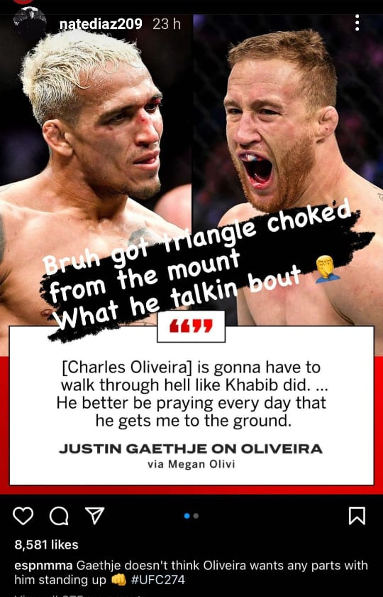 A confiança de Gaethje é tanta que, em recente entrevista, o desafiante prometeu levar o campeão para o inferno, assim como fez com Nurmagomedov antes de ser derrotado. A declaração do americano pegou outro astro da companhia de surpresa. Através de sua conta no ‘Instagram’ (veja abaixo), Nate Diaz questionou e debochou da afirmação do rival.