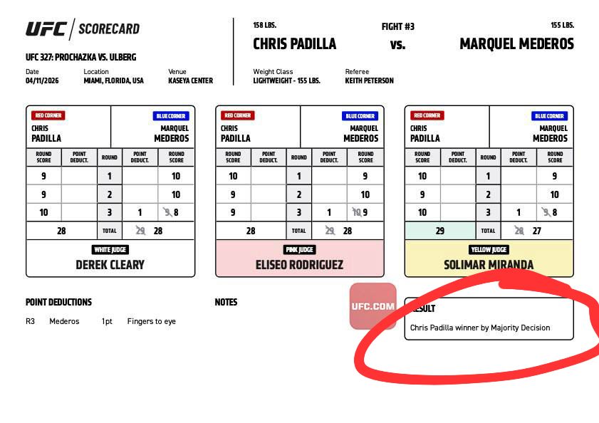 De acordo com as pontuações registradas, dois juízes marcaram empate em 28 a 28, enquanto um terceiro anotou 29 a 28 a favor de Padilla. Dessa forma, o resultado correto seria um empate majoritário, e não a vitória inicialmente anunciada para um dos competidores.