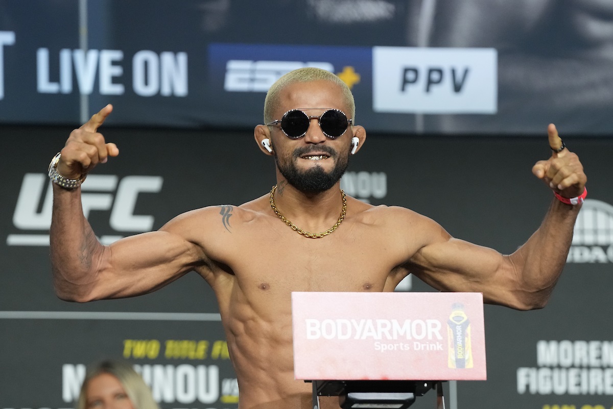 ANAHEIM, CA - January 21: Deiveson Figueiredo steps on the scale for the ceremonial weigh-ins in front of California fans at Anaheim Convention Center for UFC270 - Ngannou vs Gane - Ceremonial Weigh-in on January 21, 2022 in Anaheim, California, United States. (Photo by Louis Grasse/PxImages)