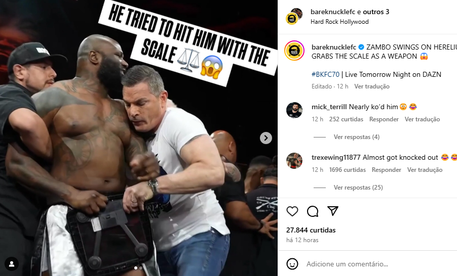 Nesta quinta-feira (27), na Flórida (EUA), o ‘BKFC’ promove mais um de seus eventos de boxe sem luvas. Mas este card em específico ganhou uma atenção especial dos fãs por uma situação bastante inusitada. Às vésperas do show – mais especificamente um dia antes -, durante a pesagem oficial, os protagonistas do ‘co-main event’ roubaram a cena com uma confusão em cima do palco. Em meio a provocações e agressões, Steve Herelius viralizou ao pegar a balança da cerimônia para tentar atacar Leonardo Perdomo, seu rival (veja abaixo ou clique aqui).